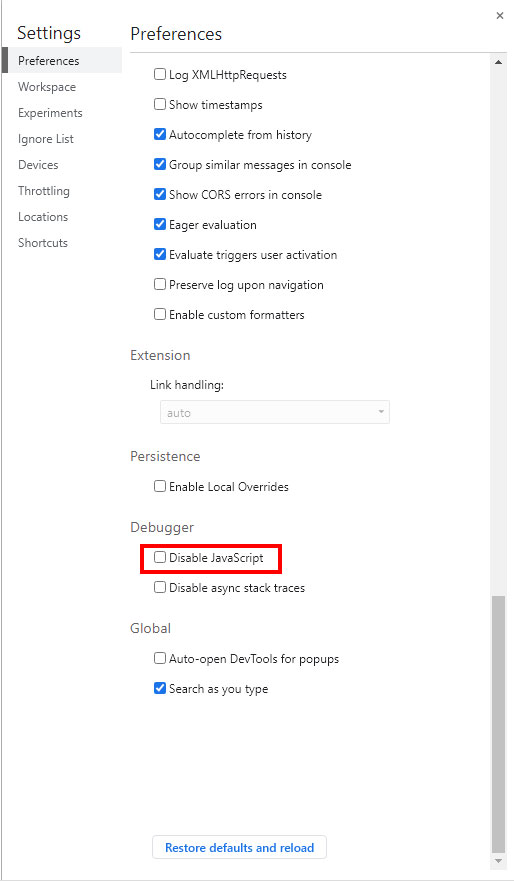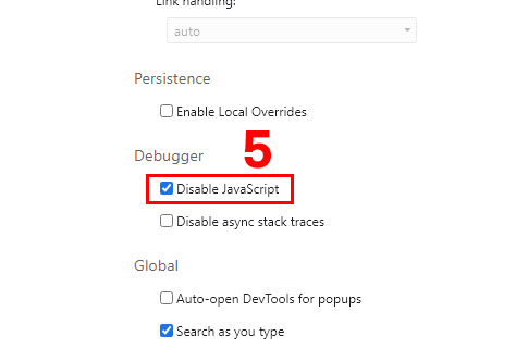 드래그 쭉쭉 내리다보면 Debugger- Disable JavaScript가 보여요.